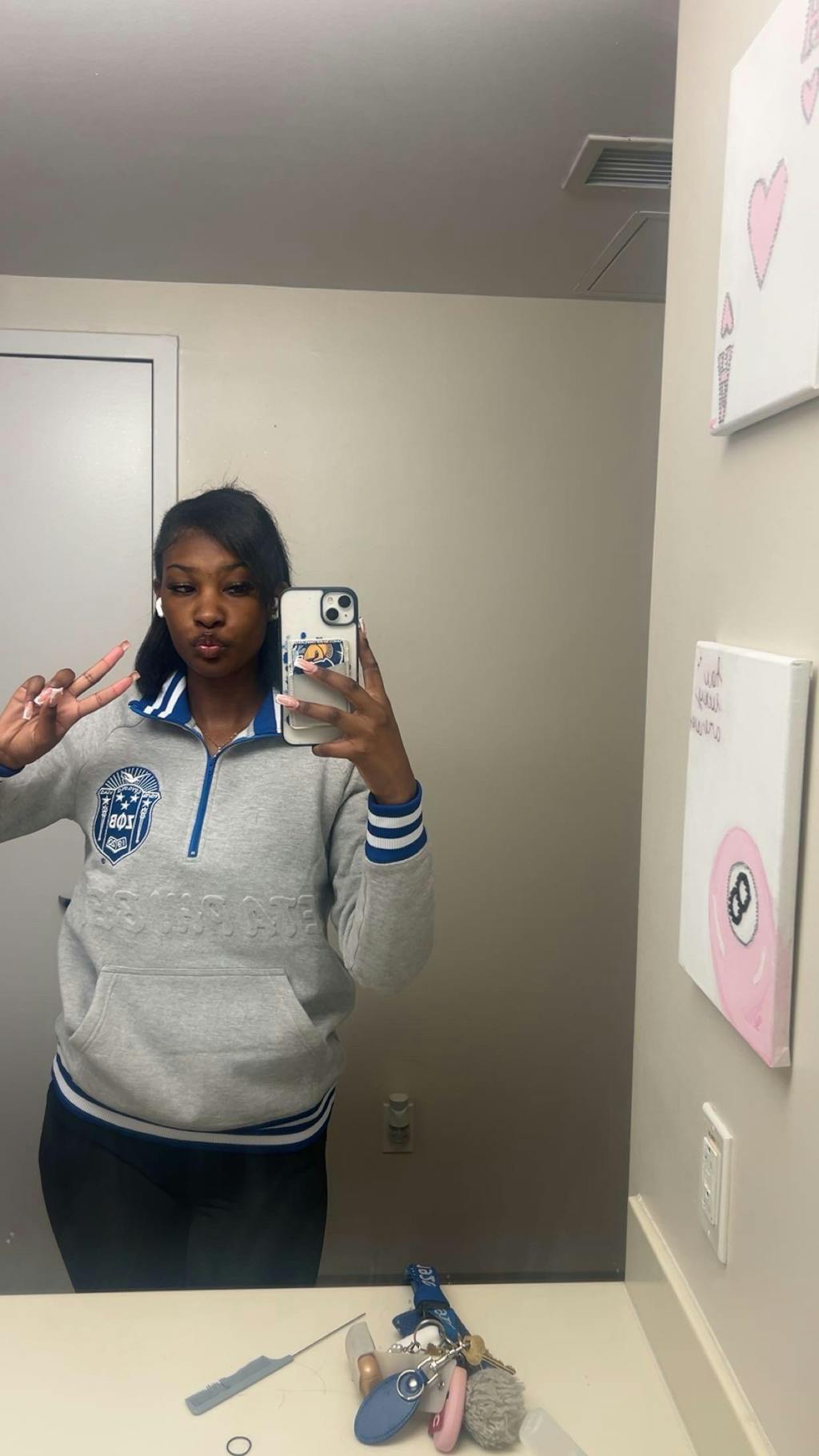 I am absolutely obsessed with this sweatshirt! I was looking for something versatile for fall, and this is truly the perfect addition to my Zeta wardrobe. It is incredibly stylish and can easily be dressed up with leggings and boots or dressed down for a cozy lounging day. Regarding the fit, it is definitely true to size— and it has that perfect slightly relaxed fit without being too baggy. The quality of the material is thick and soft, making it so cozy. It is just so cute and I’ve already received so many compliments. This is officially my perfect Zeta Phi Beta sweatshirt for the season! 💙🤍